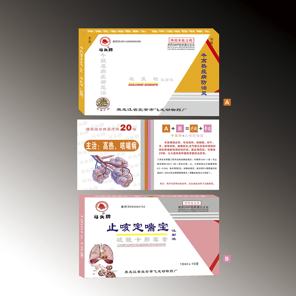 【功能主治】本套装组合药,专治高热、咳喘病。对牛、羊、猪等动物,胸膜肺炎,支气管炎及各种原因所致的哮喘都有很好的疗效。联合用药后,可增效20倍,大大提高各种重危患畜的治愈率。