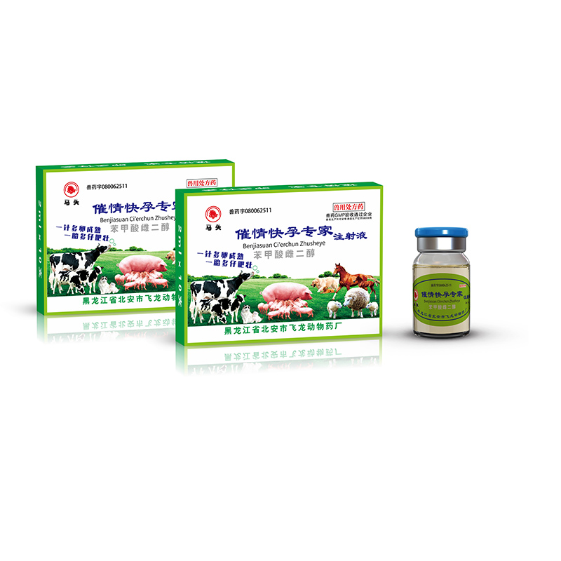 | 【用法与用量】 | 肌内注射:一次量,牛、马、马鹿10ml;羊、梅花鹿1.5ml(60公斤以上体格较大的羊、梅花鹿用量3~5ml);猪5ml;犬0.25ml;猫0.2ml。 1、给药后3~5天基本都能发情排卵,一般在发情第二天配种,连续2天每天输精一次。 2、个别病情较重的动物,第一次给药后,6天还不发情,可在第一次给药后,第7天再给药一次。2次给药的重度病例,基本都能发情、排卵、配种受孕。 |