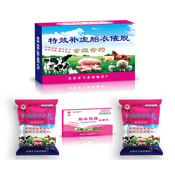 组合药用法与用量:牛、马鹿一次口服用药,“益母胎衣自脱粉” 2袋,同时用“胎衣促排注射液”10支一次肌肉注射。