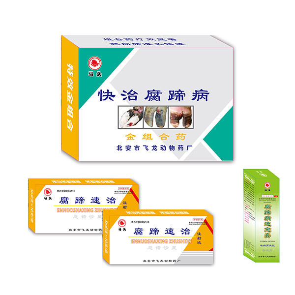 腐蹄病是夏季阴雨连绵季节,在低洼、潮湿牧场放牧,家畜四肢长时间浸泡在湿地里,或舍饲家畜动物,畜舍卫生不洁,长期站立在腐糗的粪便中,使大量病原微生物侵袭到蹄冠部,蹄部长期浸泡在水中和污物中易发生腐蹄病。该病早期发现、早期综合治疗,能较快治愈,如不及时治疗,蹄部深部组织或蹄全部组织深度感染,使患畜不敢走路,甚至出现全身症状或败血症的发生。治疗该病应采取局部治疗和全身治疗相结合的综合治疗方法。病情会很快缓解和治愈。该药是局部给药和全身治疗的 “腐蹄病组合药”,该组合药既有抑制病菌全身感染的注射药,又有疗效确切的局部外用药。两药的有效配合治疗腐蹄病,对早、中、晚、期腐蹄病都有显著的疗效。单纯用注射药或外用膏剂治疗腐蹄病,治疗效果不如组合药物综合治疗效果显著。