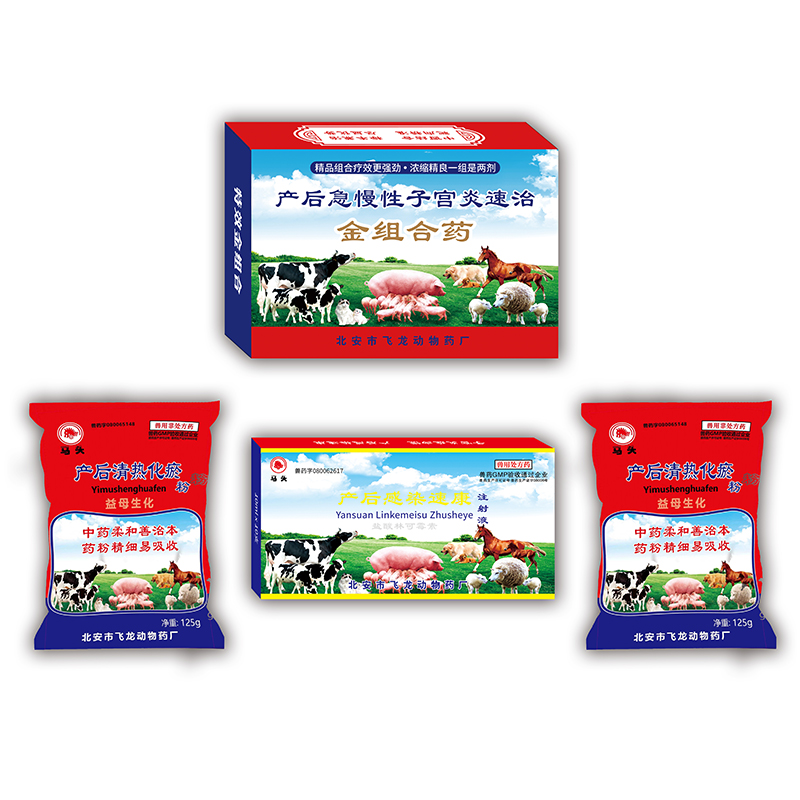 组合药用法与用量:每天用药一次。马、牛、鹿、驴、骡等大动物一次口服“产后清热化瘀粉”1袋,同时肌肉注射或用5%葡萄糖注射液500ml稀释静脉滴注“产后感染速康注射液”10ml×5支。